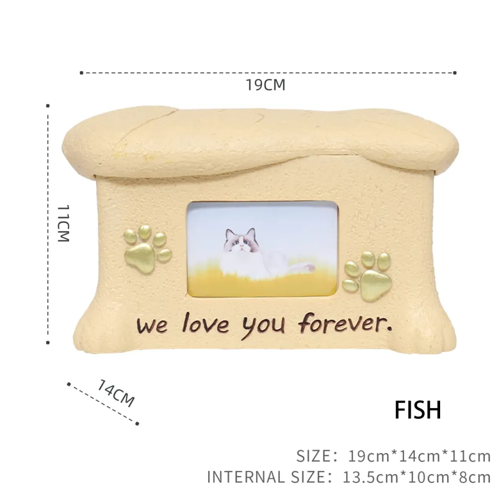 The pet urn allows one photo be inserted on the front of the box, and unique carved paw prints with it, can be placed on your fireplace mantle, shelf or table. Unlike burial sites, small urns can travel with us and enable us to keep the beloved lost ones in our hearts and lives forever.